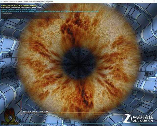我们将参数设定为1280*1024分辨率,开启8*MSAA。经过约10分钟的烤机,最终微星GTX1070TiTitanium钛金版显卡的满载温度为64℃,频率稳定在1873MHz,这个温度比公版足足低了13℃,可见该卡的散热效能的确惊人。