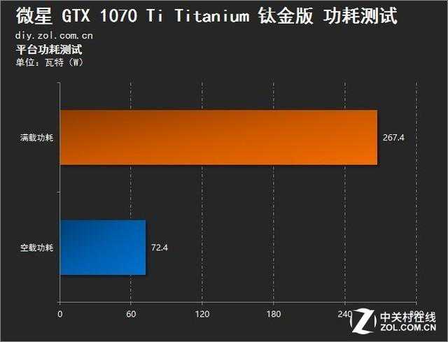 我们可以看到,在待机功耗方面,该卡还是非常低的,平台功耗仅为72W,在满载功耗方面,其平台满载峰值功耗为267W,这两个数值与公版基本持平。