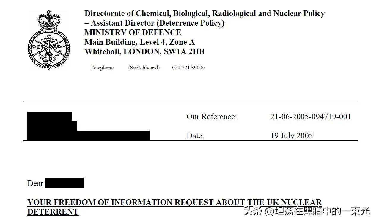一份关于英国核威慑力量的信息公开申请,该申请是2005年英国国防部对英国核威慑力量的一份信息公开申请的回复: