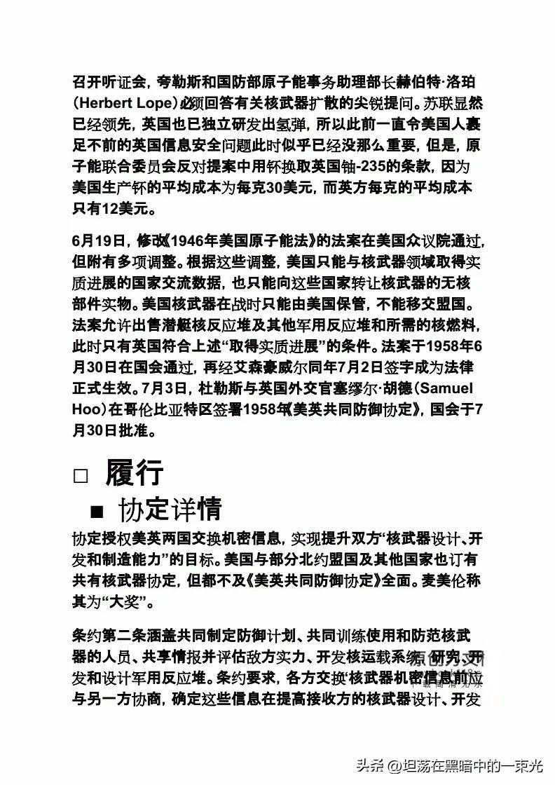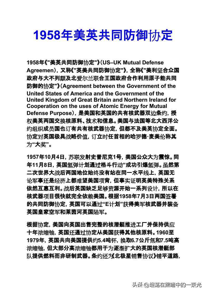 在一系列双边和多边条约中,首先需要重新研究的是美英两国于1955年签署的《为了共同防御目的的原子信息领域的合作协议》。英国认为该协议“有缺陷”和“效率不高”。作为替代,1958年制定并通过了新协议——《美国和英国之间的共同防御协议》。该协议涉及前所未有地扩大和加深两国之间的合作,其中包括核武器领域。