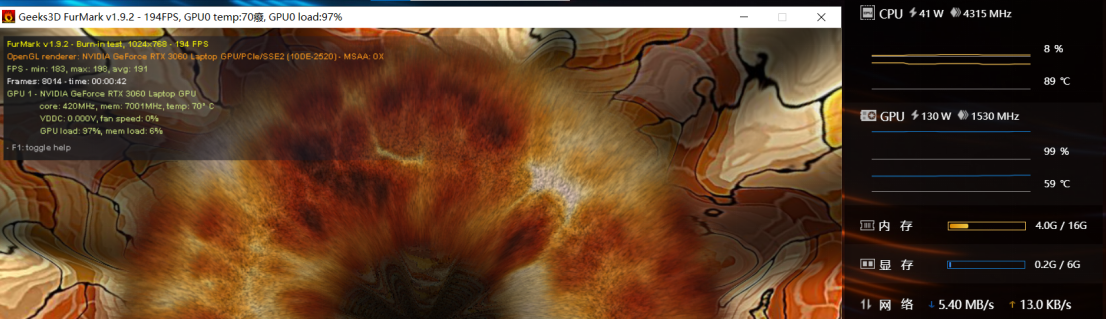 看来130w的3060果然有不小的提升,那么冲锋坦克2ProGP66的散热能否压得住呢?我们进行了几轮烤机的压力测试。在30分钟的单烤GPU的甜甜圈项目中,冲锋坦克2Pro全程能给显卡提供130w的功率,最高温度仅70℃。