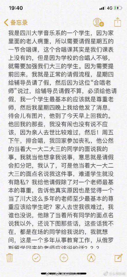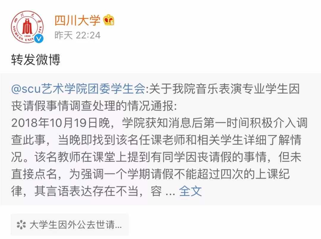 10月19日,有网友爆料,四川大学声乐系学生因家人去世向老师请假被拒,该老师表示:"你可以回去,但我要扣分。"