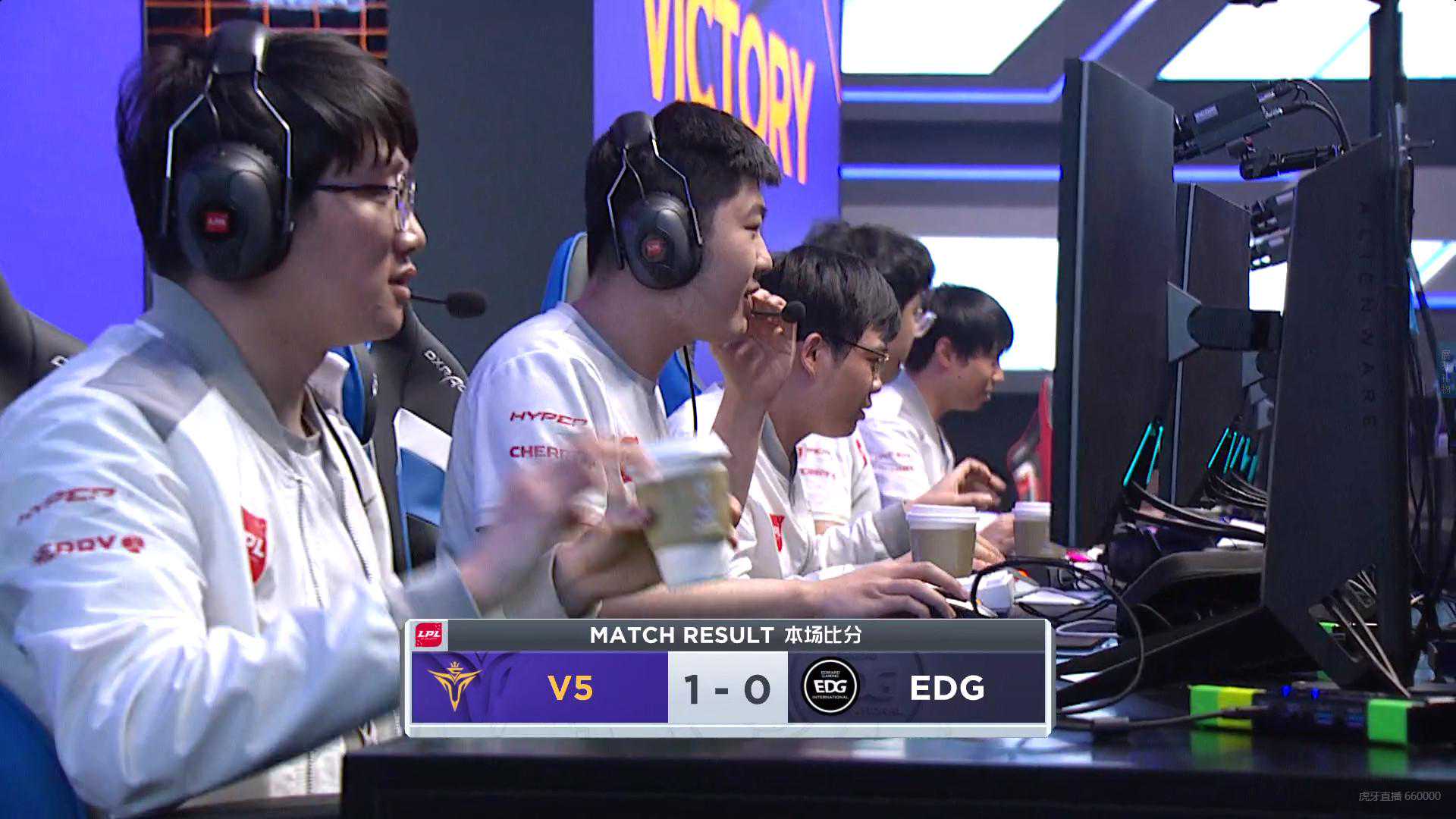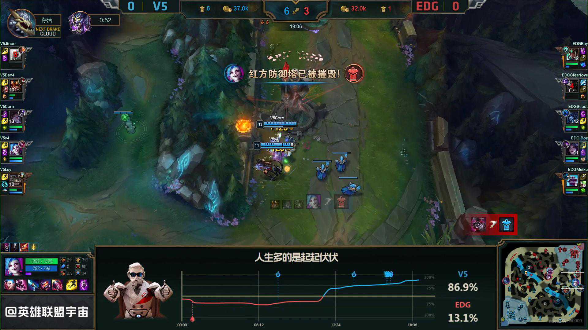 拿下大龙之后,V5根本没有任何的推进压力,直接扛着双门牙进行对EDG的屠杀,最终jinoo也是虐泉击杀了iboy,不给任何的机会可言!恭喜V5先下一城,恭喜恭喜!