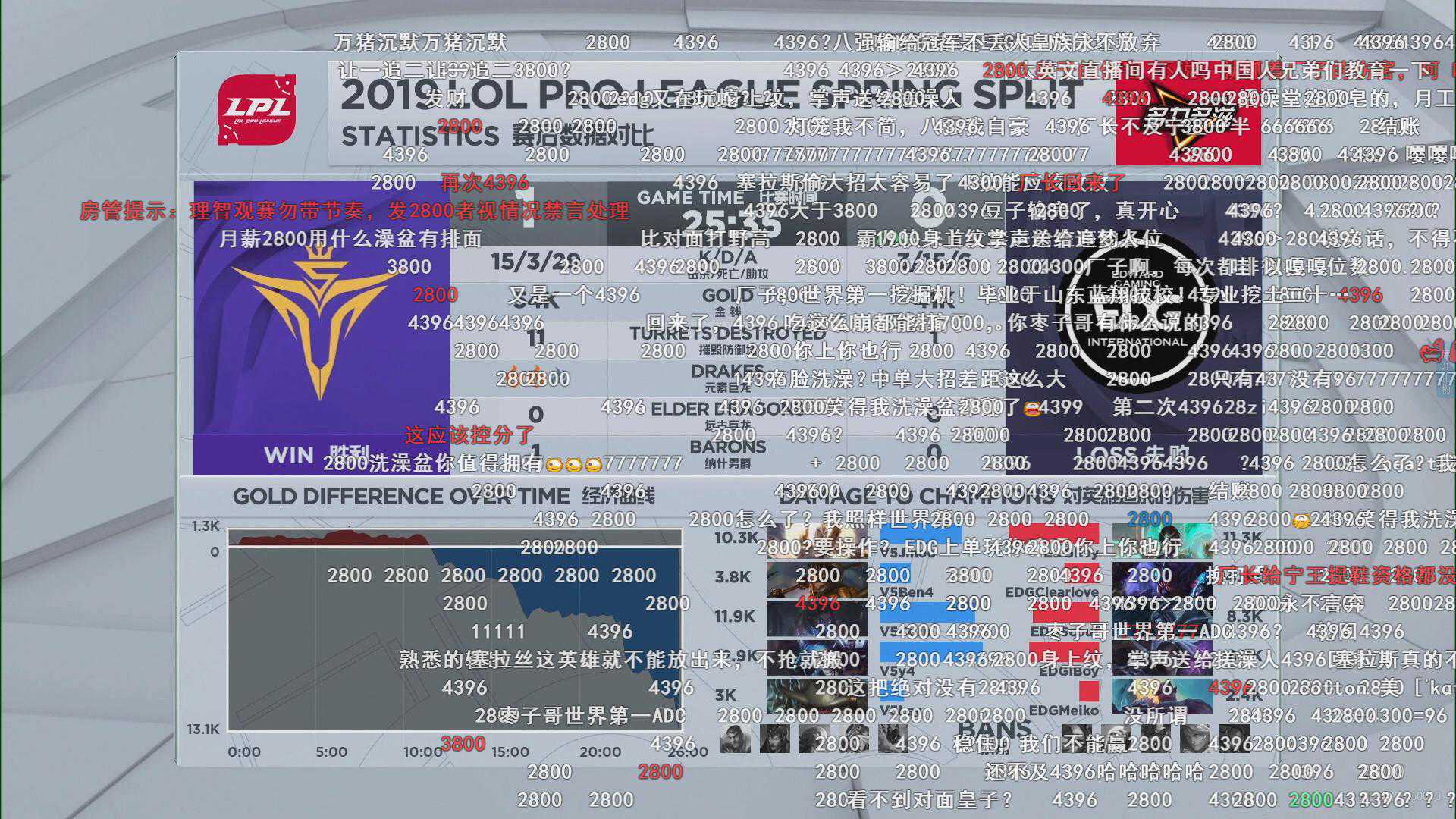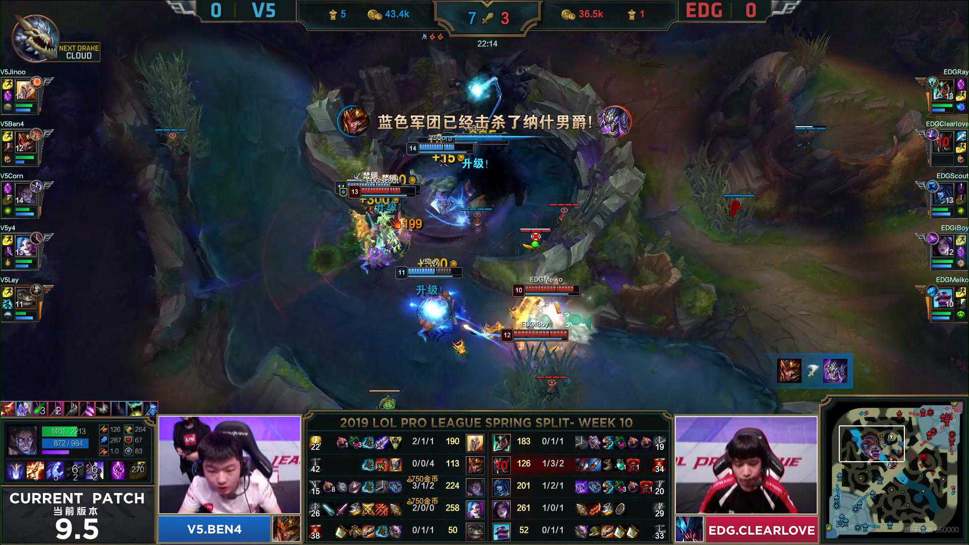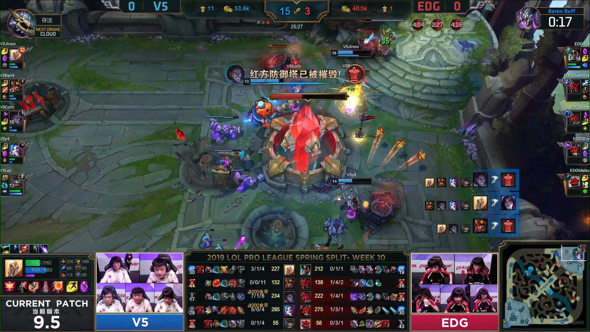 到了比赛的中期,V5已经是拥有了5K的经济优势。其实差距并不是最重要的,最重要的是,这一局V5拿到了新版凯尔,并且是无忧虑发育并且完成了一波对线单杀,jinoo这一局已经是无敌了。阵容上V5上单和AD在后期的输出太稳定了,这一局EDG已经是没有太大的机会了。