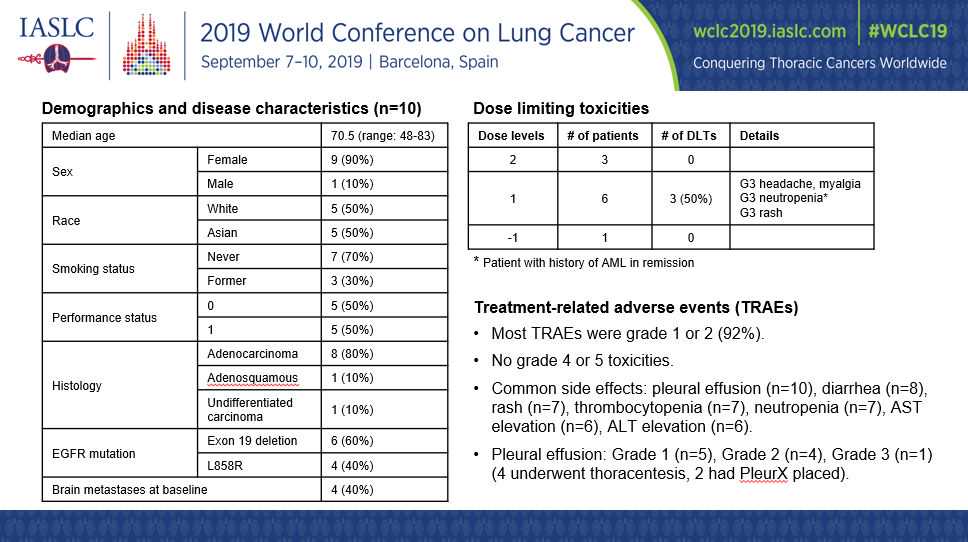 最常见的治疗相关不良事件(TRAEs)包括胸腔积液(n=9)、腹泻(n=8)、皮疹(n=7)、AST升高(n=6)、ALT升高(n=6),其中大多数为1级或2级。出现1/2/3级胸腔积液患者人数分别为4例、4例、1例。7例(70%)患者出现3级TRAEs。未观察到4级或5级毒性。
