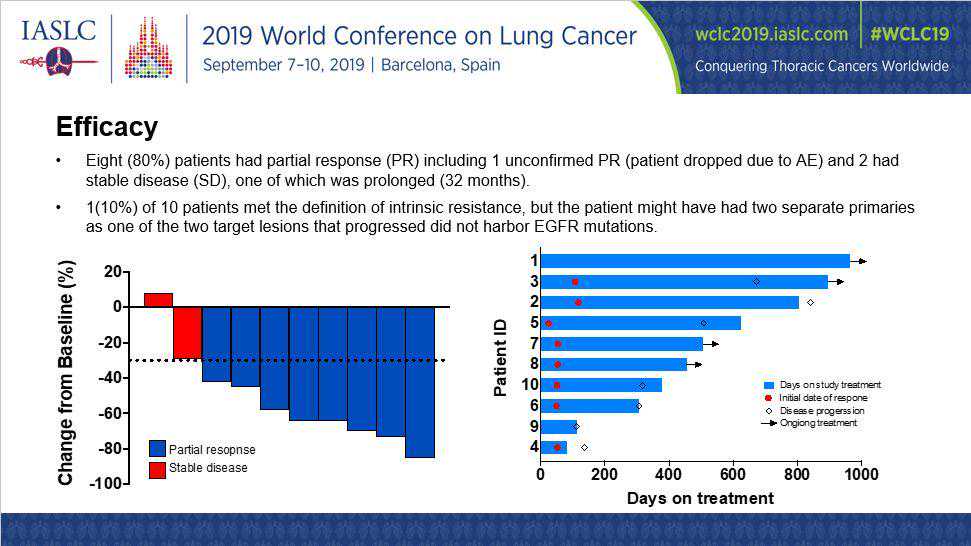 II期推荐剂量为奥希替尼80mgQD和达沙替尼70mgQD,目前正在进行药代动力学(PK)分析。由于在一线批准奥希替尼后其累积缓慢,该试验目前已停止入组。