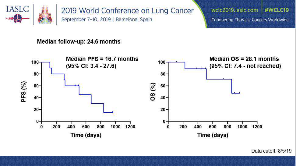 8例(80%)患者出现肿瘤部分缓解(PR)(包括1例未证实的PR),2例病情稳定(SD)。中位无进展生存期(PFS)为27.2个月;中位总生存期(OS)未达到。