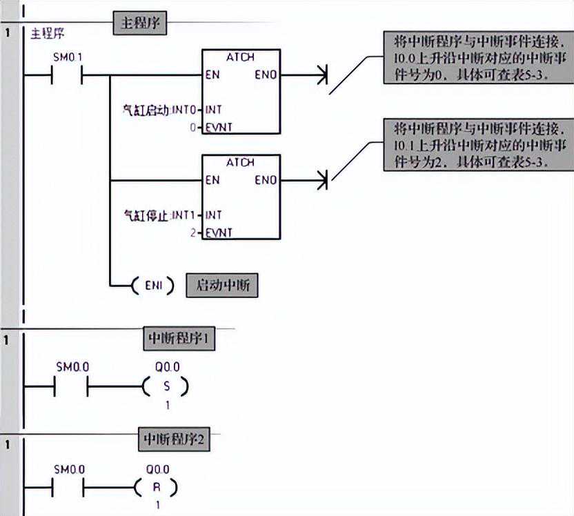 首个扫描周期将中断程序与相应的中断事件连接,上升沿中断对应的中断事件号为0,上升沿中断对应的中断事件号为2,因此,第一和第二个中断连接指令;接着启动中断,用到开中断指令ENI;最后编写气缸启动和停止中断程序。