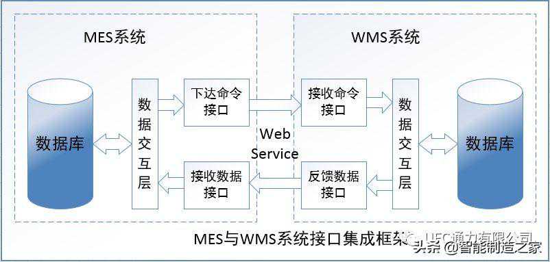两个系统信息化集成的核心是系统接口的设计,接口设计不仅需要保持MES系统和WMS系统各自的完整性与一致性,还必须以生产过程中实际的业务流程和业务运作的可行性为出发点,设计采用WebService技术进行数据交互。MES与WMS系统接口集成框架: