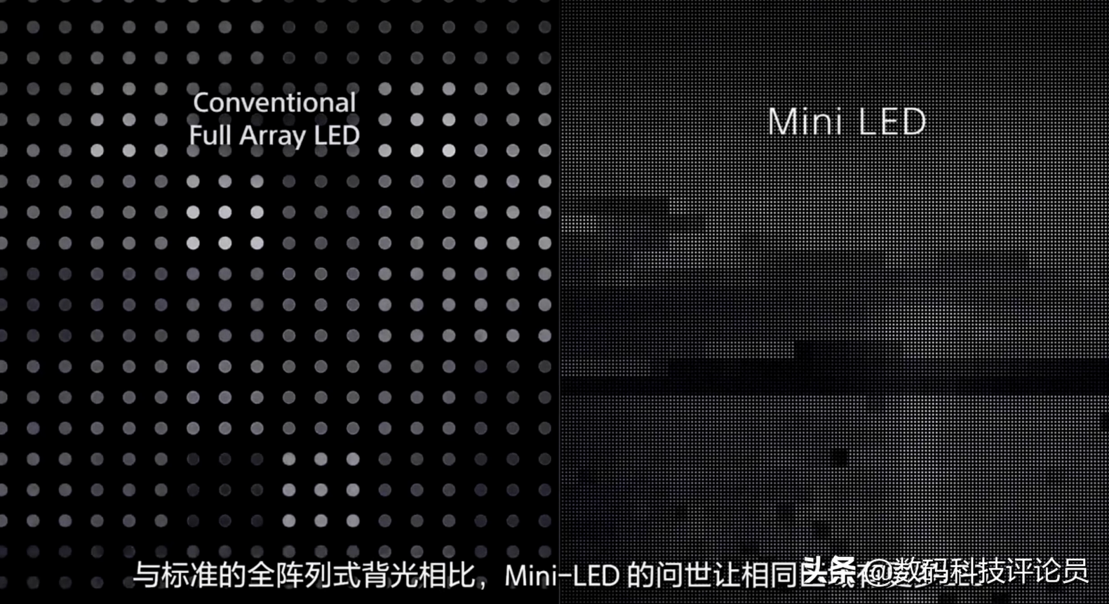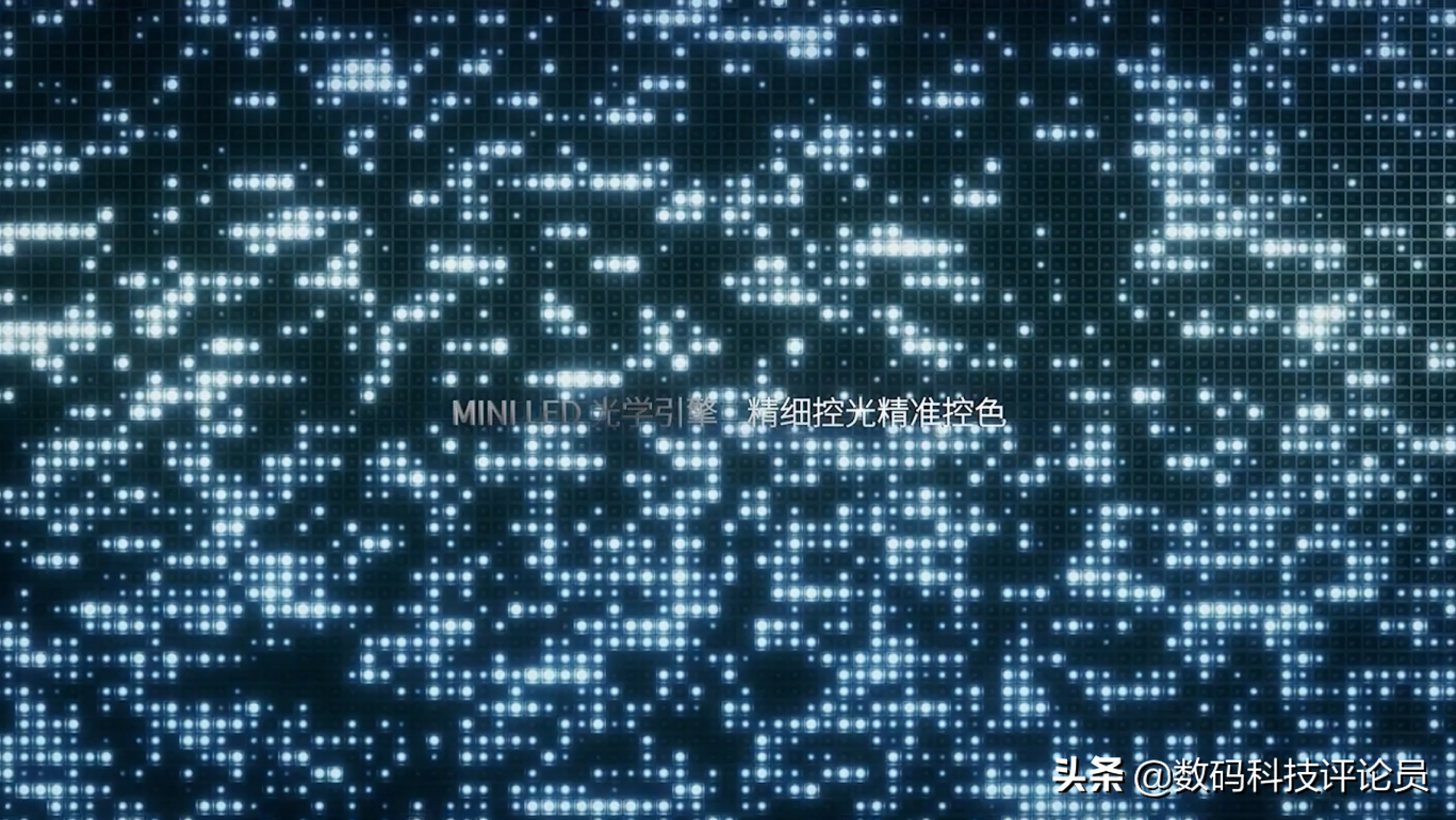 而MiniLED则把是把一整块背光模块,缩小成一颗颗50-200微米之间的LED小灯珠,并且可以单独控制开关,大家可以脑补一下,同样是显示一页内容,一边是一整块背光整体开关,另外一边是像素点单独控制小灯珠开关,很明显MiniLED控光精细程度会比LED电视高得多。