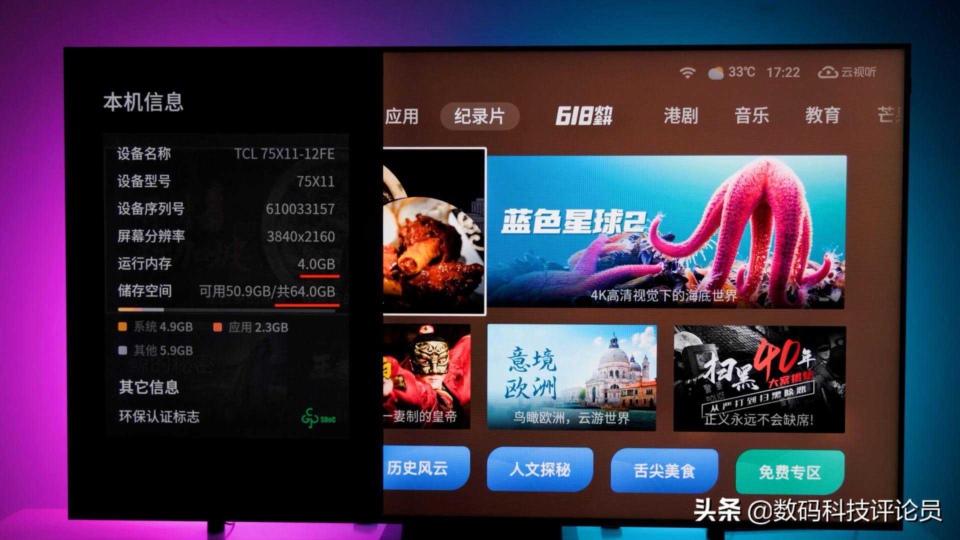 4+64G存储组合,搭配这套自带的电视系统操作起来非常的流畅,只要网速跟得上,基本上都是秒开,操作起来非常流畅。