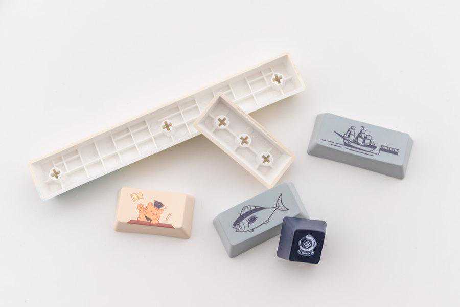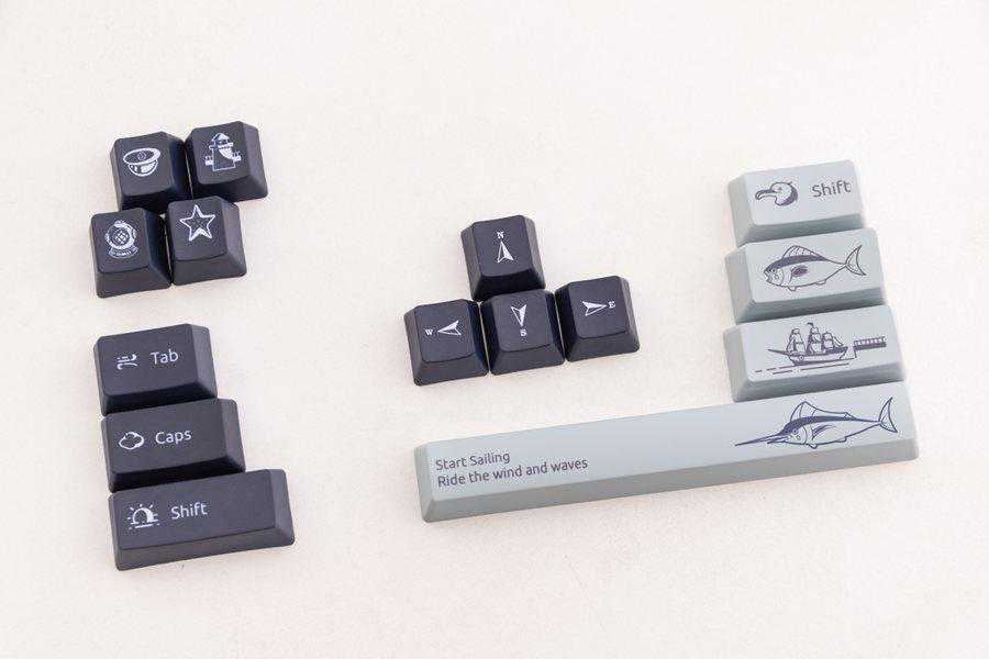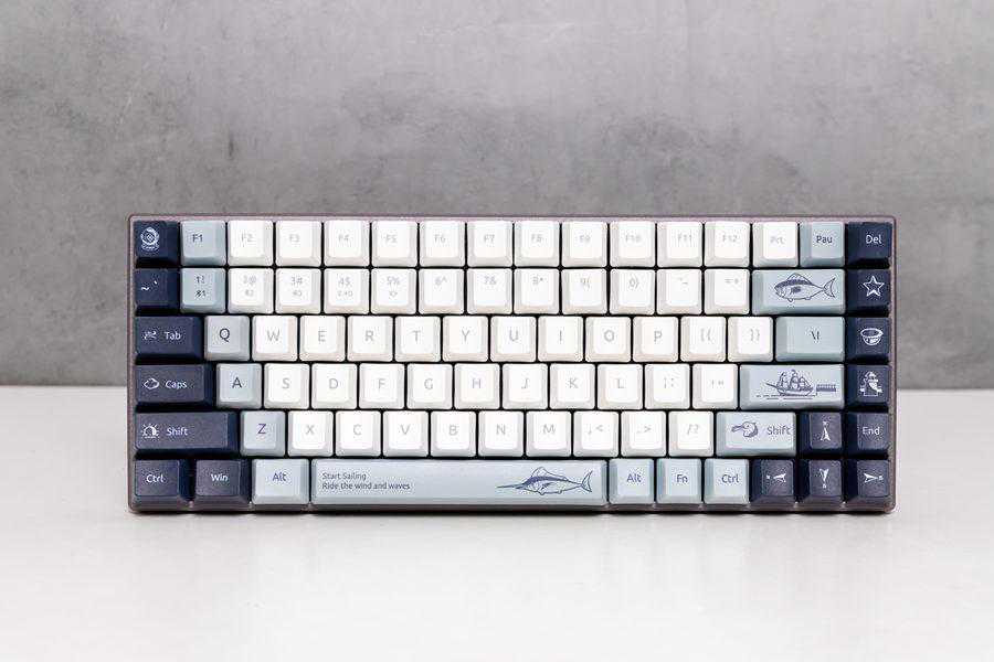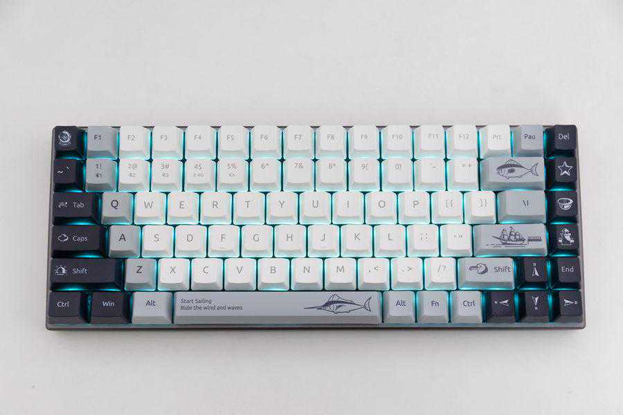 雷柏MT510PRO多模无线机械键盘的航海日记主题配色,通过五面的热升华工艺加入了指南针、灯塔、船长帽等各种海洋元素,通过灰白主色,深海蓝辅色带来了漫长航海中静谧的感觉。航海日记主题版本的键盘字符设计更显方正,看起来非常沉稳。
