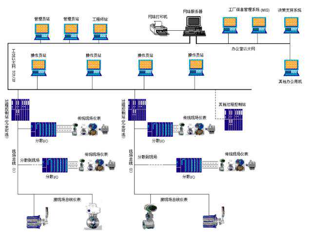 DCS通常采用若干个控制器(过程站)对一个生产过程中的众多控制点进行控制,各控制器间通过网络连接并可进行数据交换。