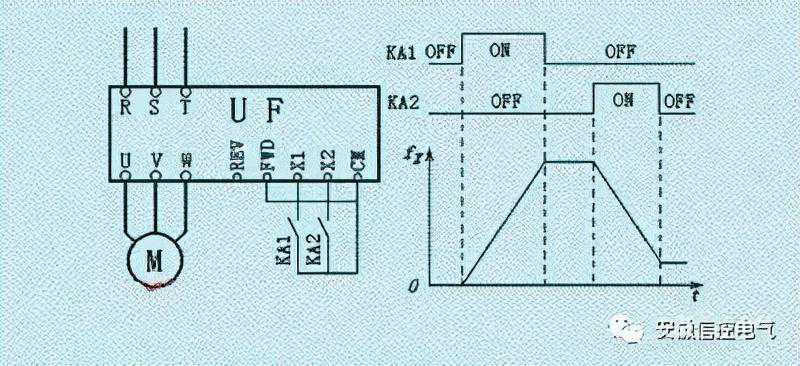 当KA2闭合时,X2得到信号,变频器的输出频率下降;KA2断开时,输出频率保持(如需要,也可以不保持)。