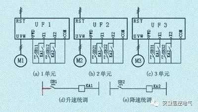 按下SB1,继电器KA1得电,其触点分别将各变频器的X1-COM接通,各单元电动机同时升速;