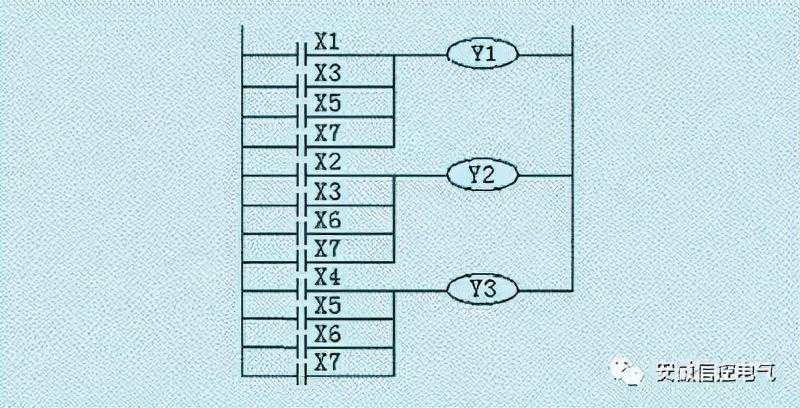 M4、M5、M6、M7中只要有一个接通,则Y3“动作”→变频器的S3端接通。