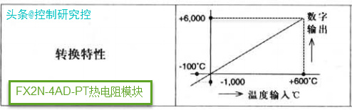 这个图是FX2N的PT温度模块读取PT100热电阻时的数据。从这个图可以看到温度是600°C的时候,这个模块输出给CPU的数值是6000;温度为-100°C时,输出的数值是-1000,也就是说这个模块将PT100热电阻接入后,得到的数据和实际温度之间有一个10倍关系,即温度值的10倍就是PLC读入的数据。