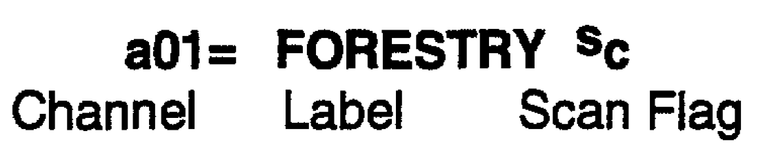 ID或通道标签信息。这是一个名字,如“FORESTRY,HOSPITAL”林业,医院或“BASE5.”基地5。显示格式显示“CHANNEL”通道号、“IDLABEL,”ID标签和任何“SCANFLAGS”扫描标志。