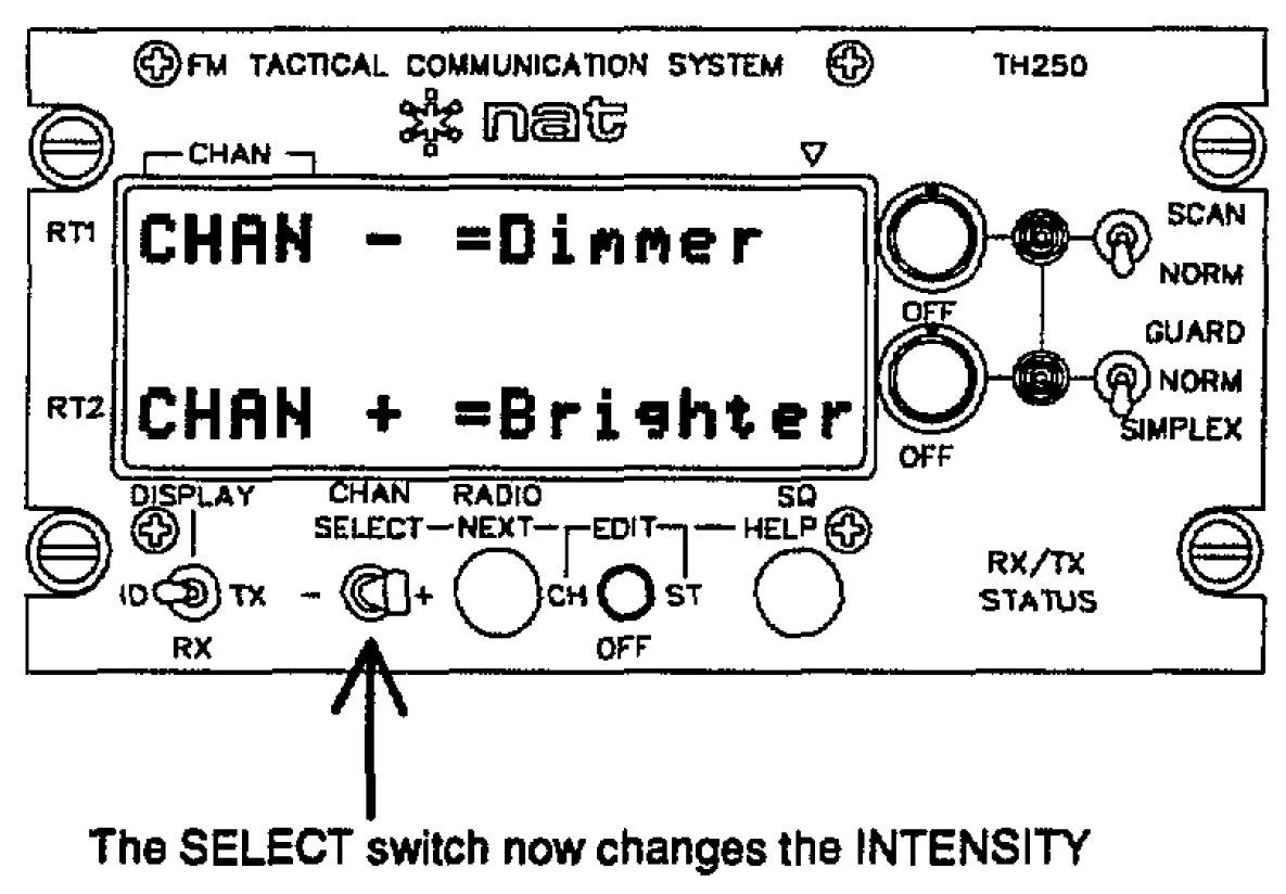 NATTac/Com控制头为每个存储的无线电台信息通道提供三个显示器,由控制头左下侧的“DISPLAY”显示开关设置。