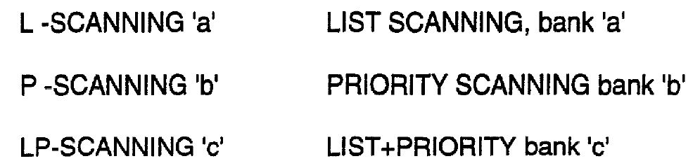 在米德兰“Syn-TechI收发机”上,添加到扫描列表的频道将有字母“a”或ID标签显示末端的字母“b”。状态行用于选择在“SCAN”模式中是使用列表b还是列表a和b。仅列出在优先级模式中使用的通道。伍尔夫斯伯格无线电台不提供扫描,因为它们的合成器锁定时间非常长,这排除了扫描。