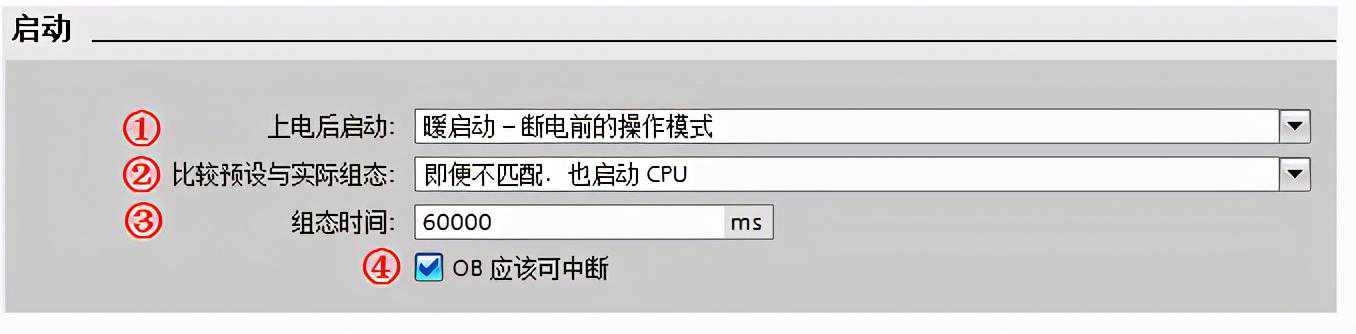 S7-1200CPU通电后,它在开始执行循环用户程序之前首先执行启动程序。CPU支持以下组态选项: