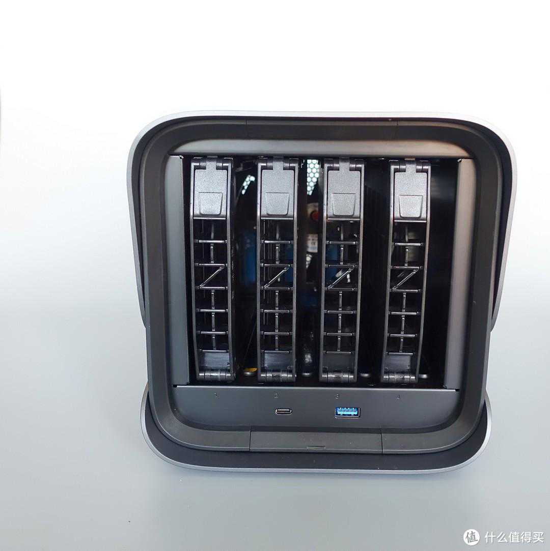 从另一侧角度来看,更像是一个Z形了。讲道理我个人挺喜欢这个炫酷的造型,感觉比起方方正正的传统NAS来说,科技范儿更足。