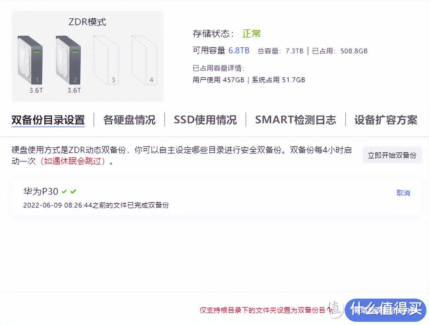 极空间ZOS系统体验与群晖不同,极空间ZOS将存储池管理作为单独的套件拉出来,而是直接整合到了系统设置中,在这里能对ZDR双备份功能和硬盘的相关数据进行观察。