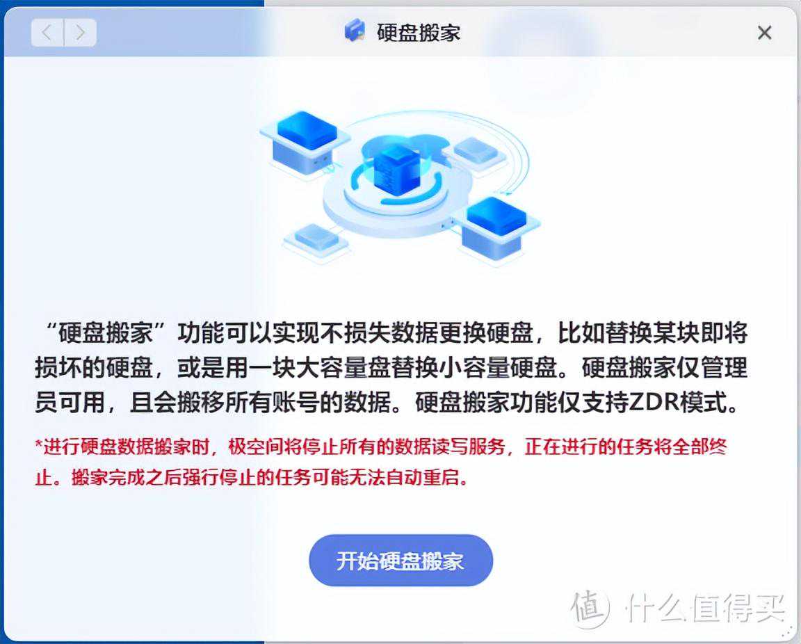 另外,如果需要更换硬盘的话,极空间提供了“硬盘搬家“功能,对于ZDR模式,可以实现不损失数据更换硬盘,对新手来说免去了折腾RAID磁盘阵列的麻烦。