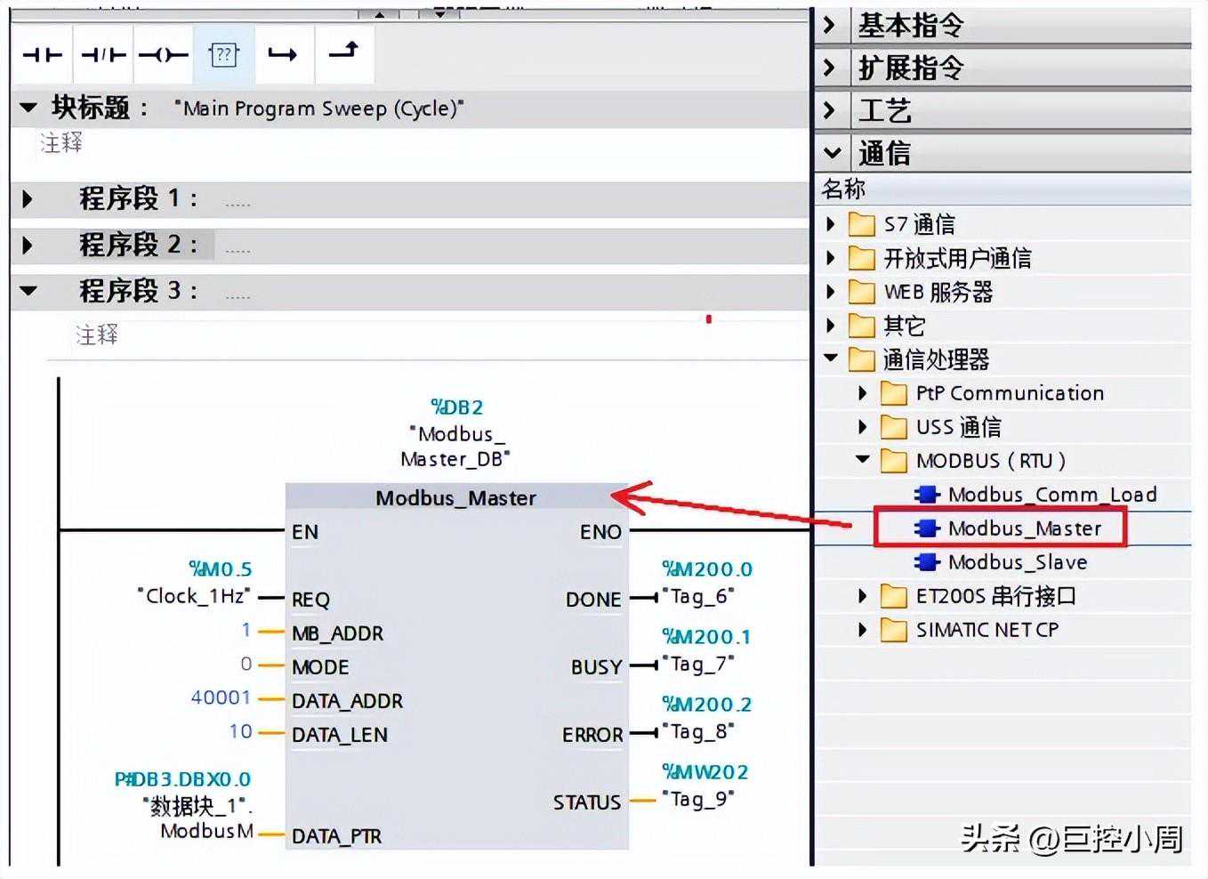 以S7-1500做主站为例,我们在程序中,只需要调用“Modbus_Comm_load”和“Modbus_Master”即可。