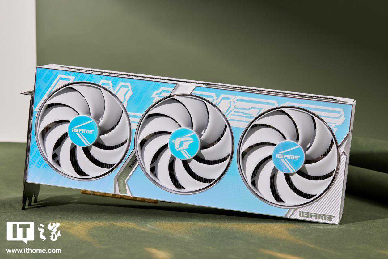iGameGeForceRTX4070UltraWV2显卡采用了三风扇设计,每个风扇由9片白色的环形扇叶组成,中间点缀着蓝白色的Logo。显卡四周装有一圈金属包边,突出了其硬朗的外观风格。这款显卡配备了豪华的散热模组,可以轻松应对仅200W的RTX4070显卡的散热需求。
