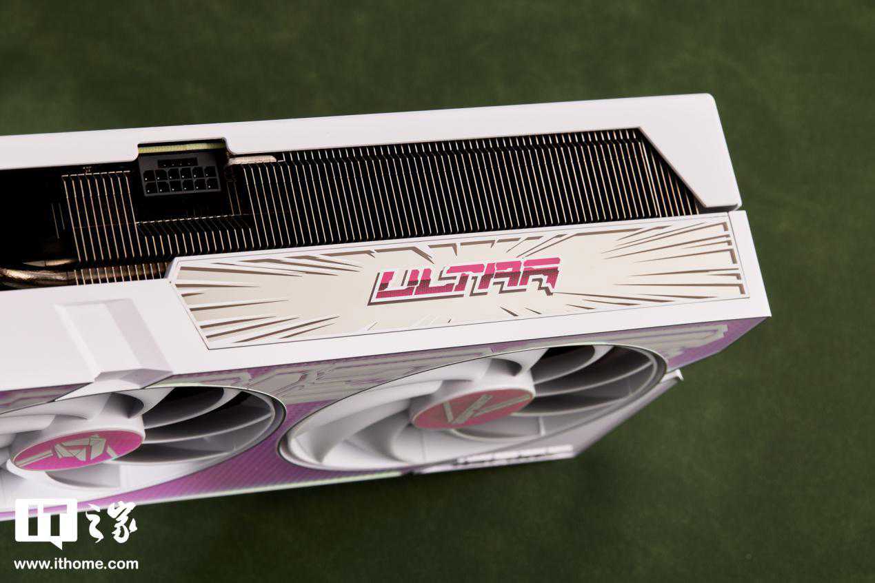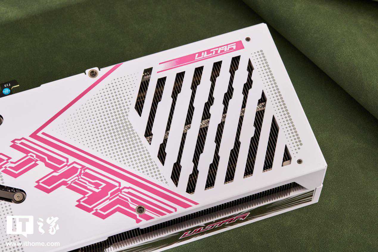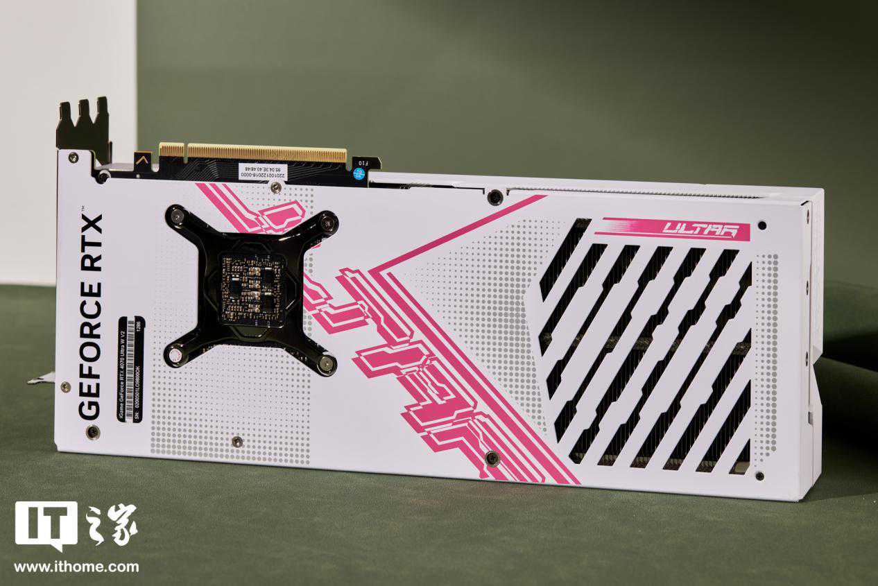 iGameGeForceRTX4070UltraWV2显卡的背板主体呈现白色,饰以粉色的UltraLogo,色彩鲜艳夺目。