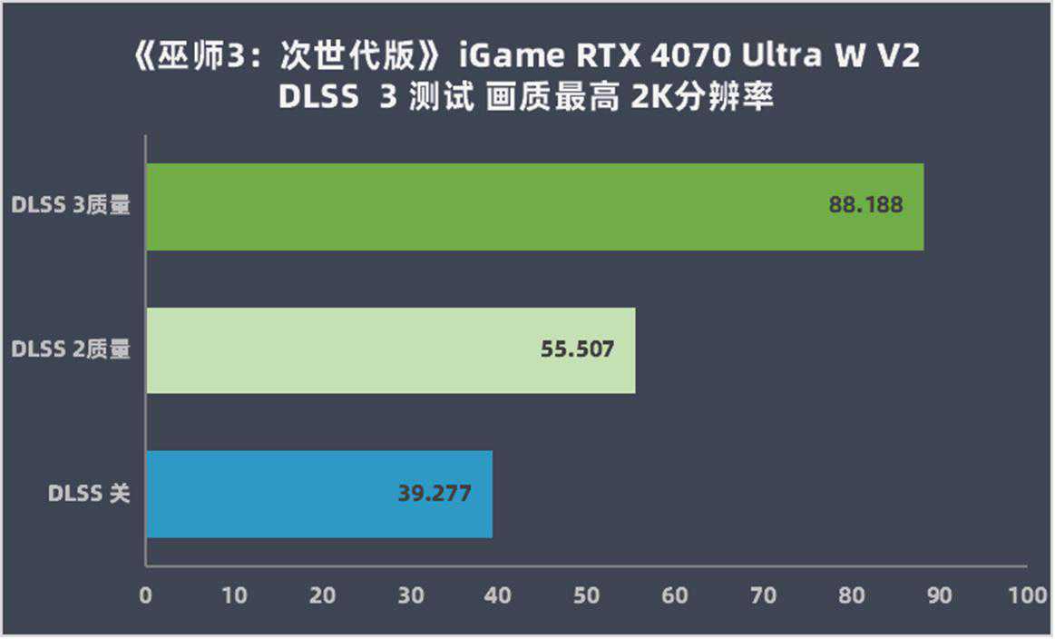 既然都是“波兰蠢驴”开发的游戏,在帧数表现上也是很类似的。在2K分辨率不开启DLSS的情况下,iGameGeForceRTX4070UltraWV2平均仅有39帧,但只需要开启质量档的DLSS3,帧数就能暴涨到平均88帧,如此便可以畅玩了。