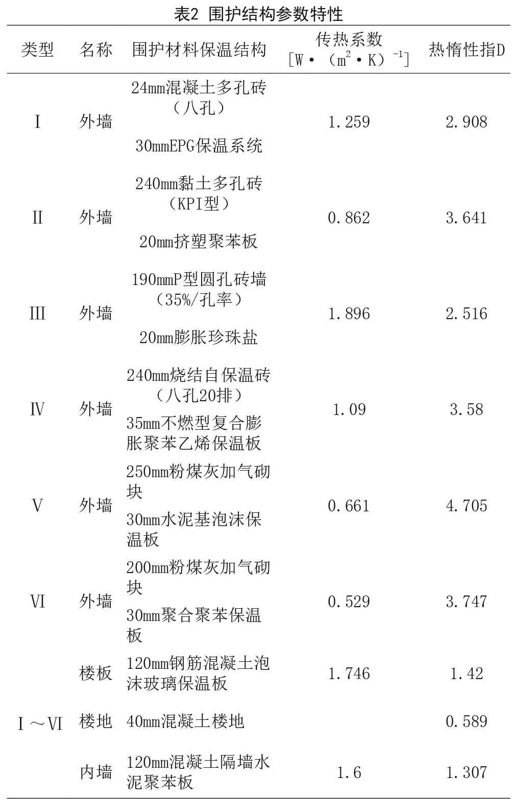 围护结构类型分为Ⅰ~Ⅵ型。Ⅰ~Ⅲ型为成都地区2001~2010年所建居住建筑三种典型外围护结构,采用的规范标准是《夏热冬冷地区居住建筑节能设计标准》(JGJ134-2001)。Ⅳ~Ⅵ型为成都地区2010年至今所建居住建筑3种典型外围护结构,采用的规范标准是《夏热冬冷地区居住建筑节能设计标准》(JGJ134-2010)。建筑围护结构参数特性见表2。