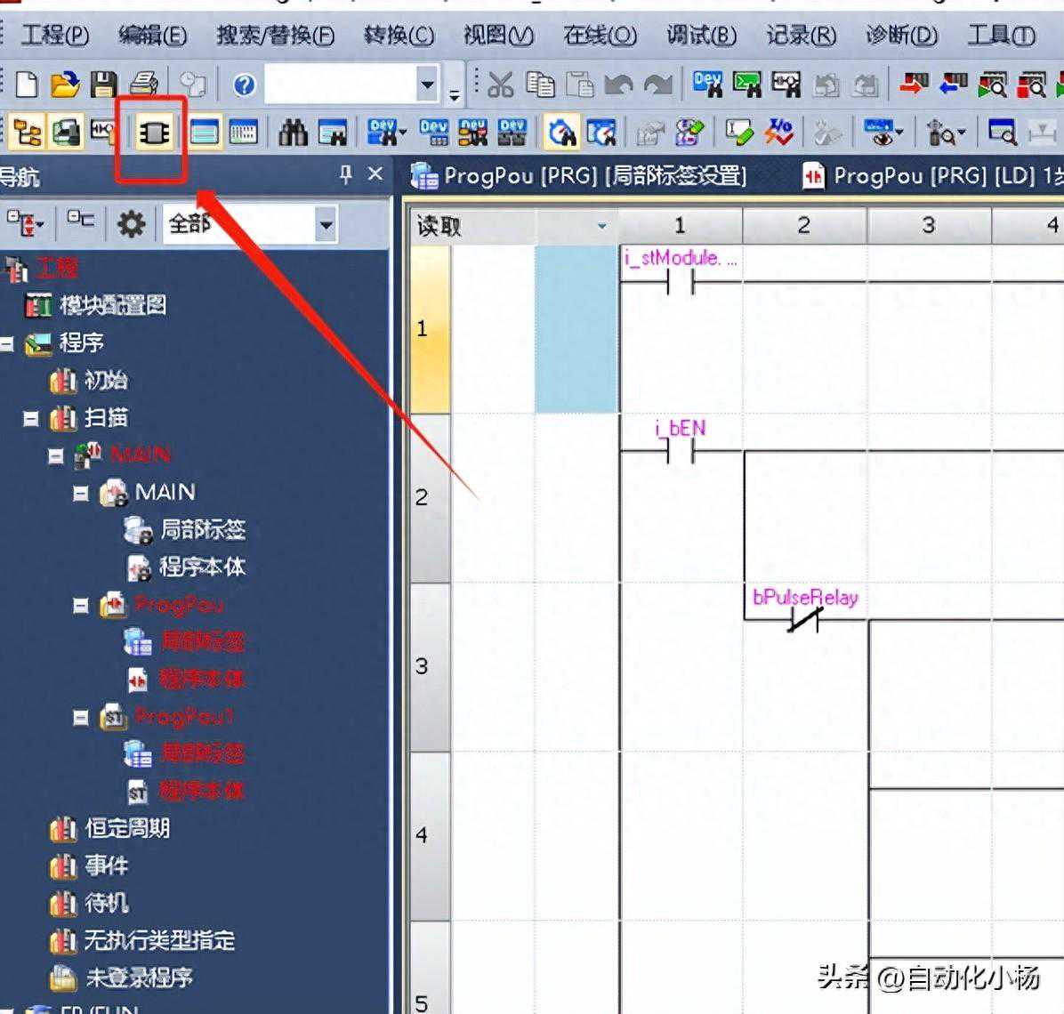 这时我们新建一个程序段可以是梯形图也可以是ST语言等都可以,这时这个模块本身自带的官方的FB块就会显示出来,我们再把它拖出来,点进去就可以看到FB块的内容。