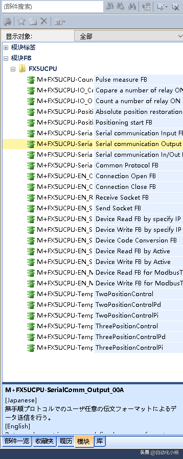在三菱的编程软件里面发现当我们在程序里面组态的模块和CPU有相应的官方的FB块的时候会在软件的这个图标的下拉菜单中显示,如下图所示:
