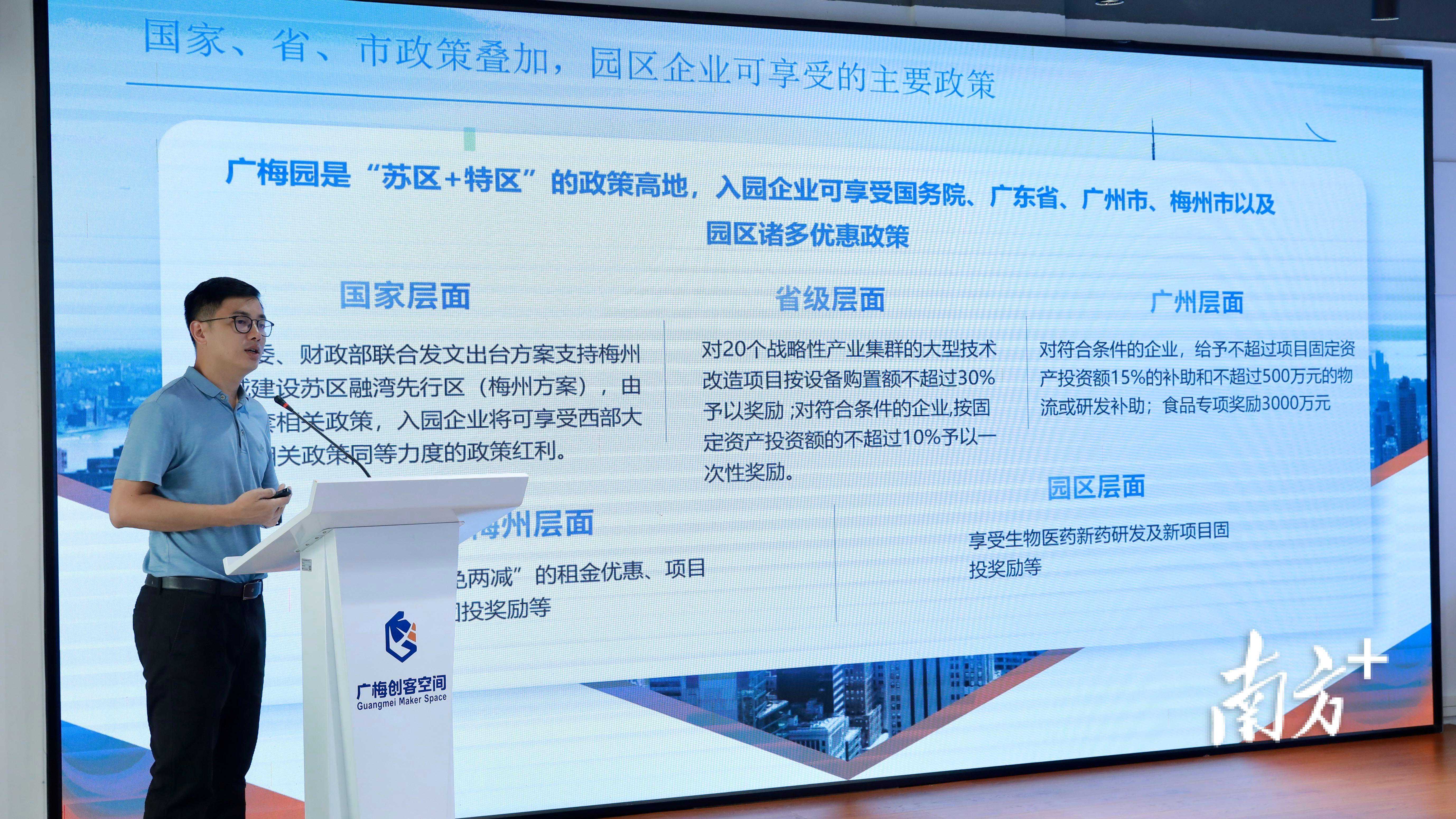 园区人力资源和社会保障局局长巫远强和园区科发局李润在政策分享中均表示,广梅园是“苏区+特区”的政策高地,入园企业不仅可享受国务院、广东省、广州市、梅州市以及园区诸多优惠政策,还可以享受到园区完善的配套设施,是企业创新发展的“风水宝地”。