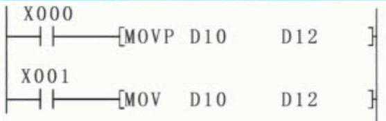 比如在图上这个梯形图中,MOVP表示脉冲执行型,当我们按下X000的时候就会把D10的数据传送到D12中,但是不管X000接通多久,这个指令只执行一次。