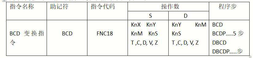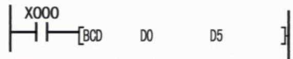 该指令表示,当接通X000后把D0中的二进制码转换成BCD码,然后送到D5里面去。在这里给大家补充一下BCD码是:BCD码亦称二进码十进数或二-十进制代码。用4位二进制数来表示1位十进制数中的0~9这10个数码。