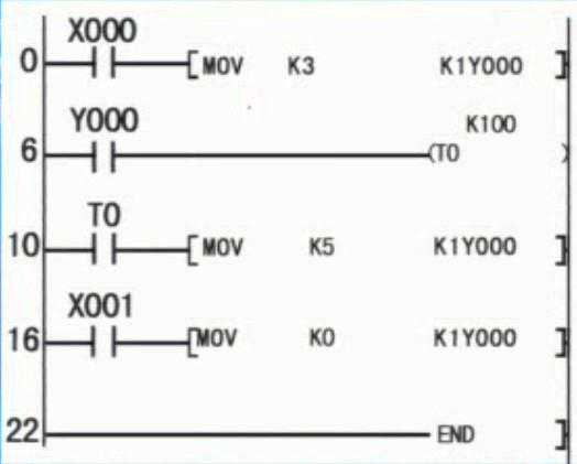 当我们按下X000后,MOV是传送指令,把K3的数据传送到K1Y000,而K3化成二进制为0011,那么K1Y000里面的数据也变成了0011,所以Y0,Y1被置为ON,电动机为星型启动,然后Y0在延时10秒后T0闭合,把K5的数据传送到K1Y000,K5化成二进制为0101,那么K1Y000里面的数据就变成了0101,Y0依旧为ON,Y1则为OFF,Y2则为ON,所以在这个时候,电动机按星型启动。当按下X000后,K0的数据传送到K1Y000,而K0化成二进制为0000,所以都变成了OFF,电动机停止。