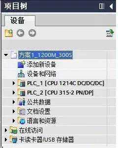 使用STEP7V12创建一个新项目,并通过“添加新设备”组态S7-1200站PLC_1,选择CPU1214CDC/DC/;接着组态S7-300站PLC_2,如图1所示。