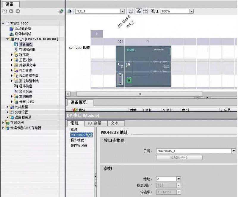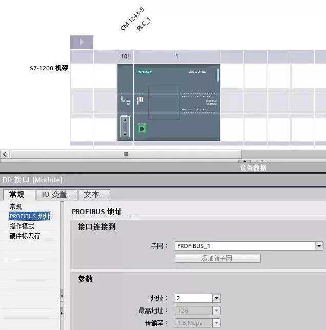 使用STEP7V12创建一个新项目,并通过“添加新设备”组态S7-1200站PLC_1,组态CM1243-5的DP接口,进入CM1243-5的属性框,添加子网“PROFIBUS_1”,站址选择2,如图5所示。