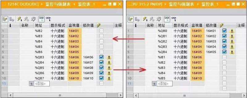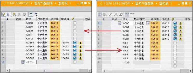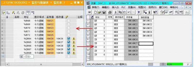 在同一项目中,分别为CPU1214C和CPU300创建监控表,进行通讯测试,如图4所示。