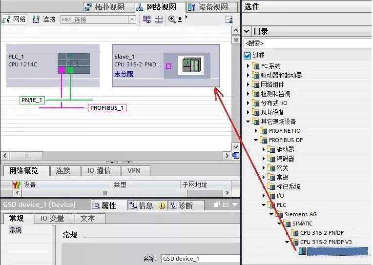 安装好从站CPU300的GSD文件,在主站项目中的网络视图中,将它从选件的目录中拖拽至视图界面中,如图7所示。