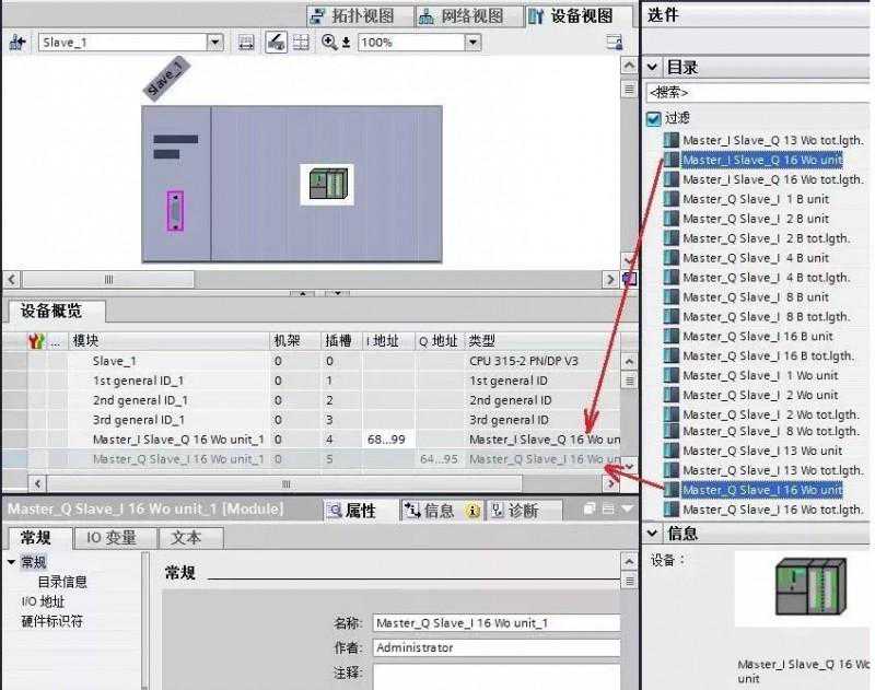 双击图7中的“Slave_1”,进入从站的设备视图,将“Master_ISlave_Q16Wounit”和“Master_QSlave_I16Wounit”分别插入到设备概览的4槽和5槽。注意:4槽表示主站组态输入16个字,5槽表示主站组态输出16个字,这与后面组态从站的输入输出需要一一对应。如图9所示。