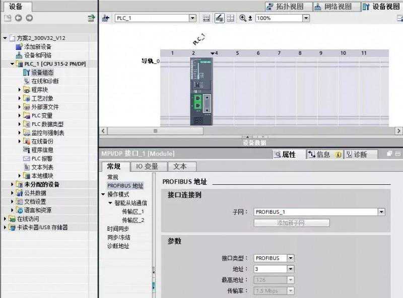 在这使用Step7V12创建一个新项目(DP从站:S7-300),并通过“添加新设备”组态S7-300站PLC_1,进入CPU300集成的DP接口的属性框,在“PROFIBUS地址”界面中,接口类型选择“PROFIBUS”,添加子网“PROFIBUS_1”,站址选择3,如图10所示。