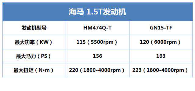 福美来与海马V70使用的代号为HM474Q-T的1.5T发动机,而海马S5与海马M6使用的是代号GN15-TF的1.5T发动机,相对而言,后者的发动机技术更为先进,这一台自主研发的发动机加入了铝制缸体、双顶置凸轮轴结构以及VVT可变气门正时技术。