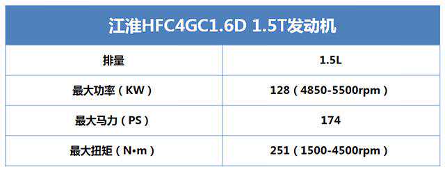 江淮也是一个拥有研发发动机的能力,一台代号为的1.5T涡轮在13年12月实现了量产,加入了缸内直喷和DVVT双进排气可变气门正时系统让其在动力参数表现方面突出,处于国产自主研发的发动机的高等水平,另外使用了霍尼韦尔涡轮增压器,在1000rpm是无论已经介入工作,而在1500rpm时已经达到最大扭矩点,发动机整体表现相当不错,而且油耗也控制在一个合适的范围。