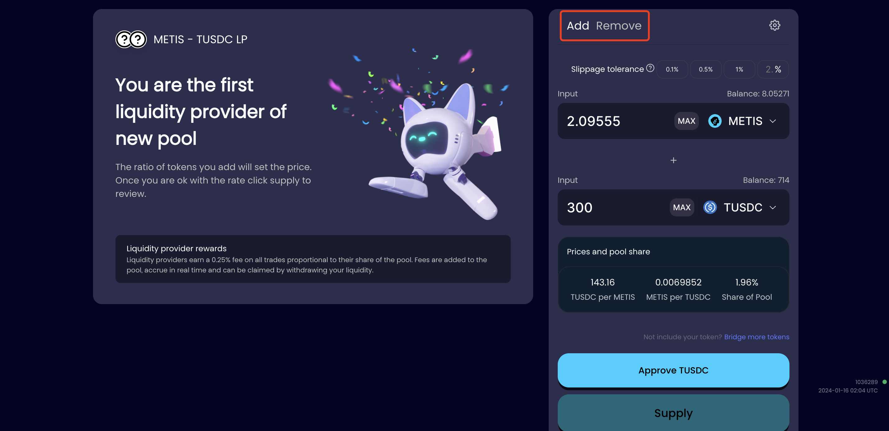 4、添加交易对,随后按步骤提供流动性;随后可再Remove处取消流动性pool;