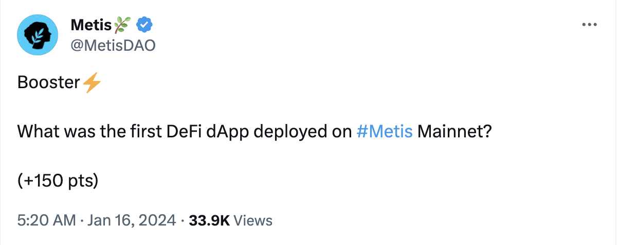 在第一季社区测试期间,Metis官方X账号将会分享谜语、问题,第一个回答正确的参与者会获得积分奖励。