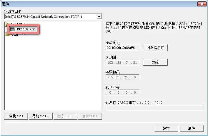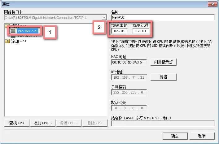 第二步:在弹出的窗口中“查找CPU”,在网络中选择要做OPC通信的PLC,紧接着设置本地和远程的TSAP号。